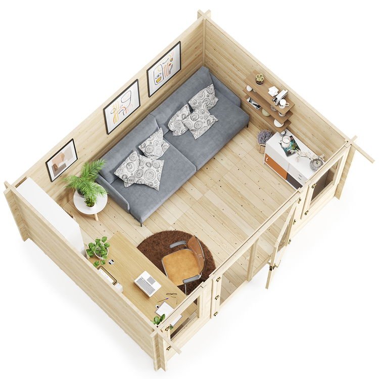 The generous size makes this cabin ideal as a summer house, garden lounge, hobby room, or entertaining area.