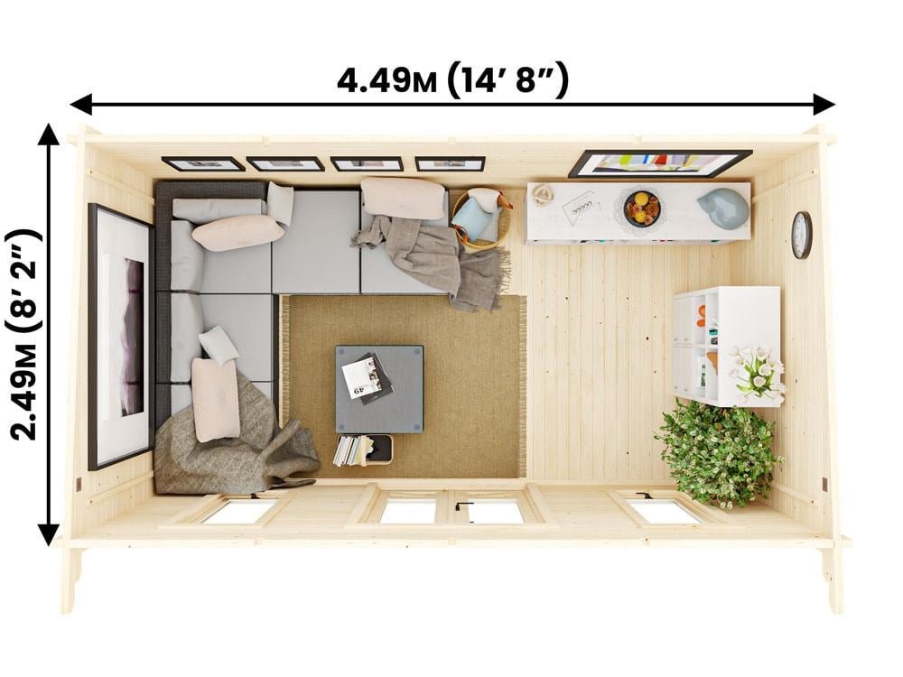 • Wall Thickness: Solid timber logs for strength and insulation