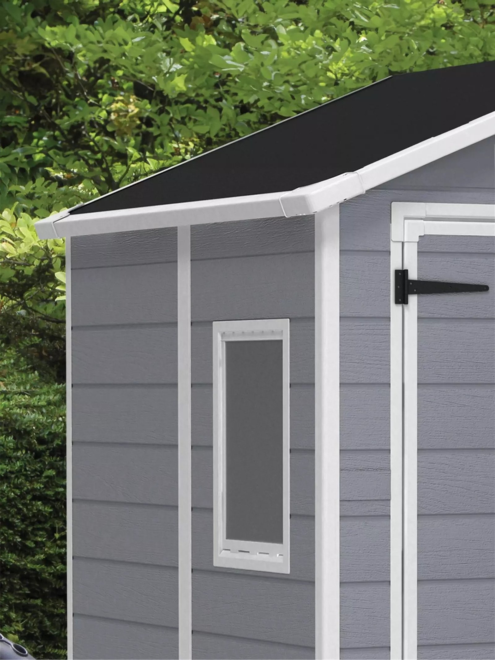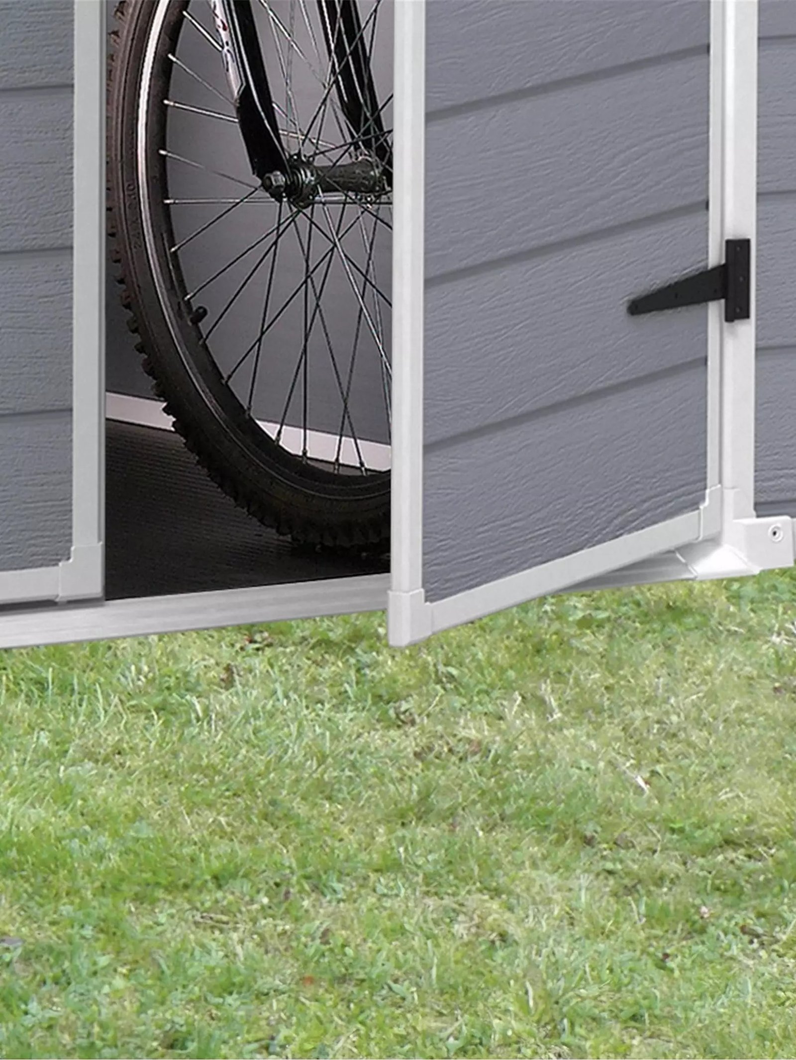 The Manor is a durable storage shed with a double wall construction that is fully weather-resistant. It also features double doors for easy access, floor panel, built-in ventilation for safety, a fixed window for natural light and has a locking system to provide added security for your items.