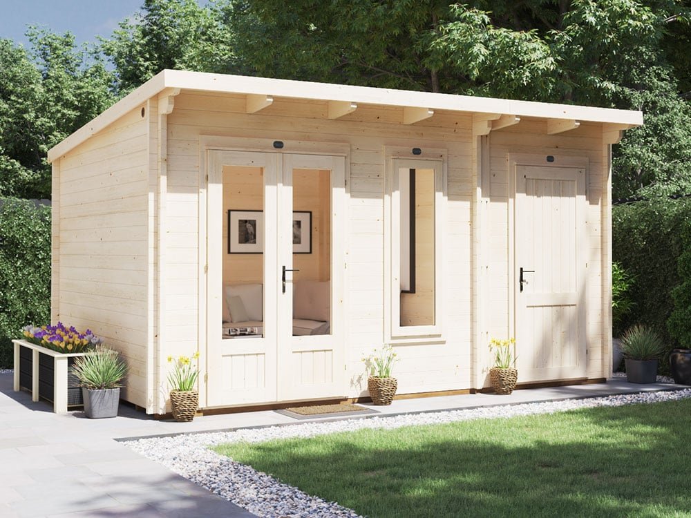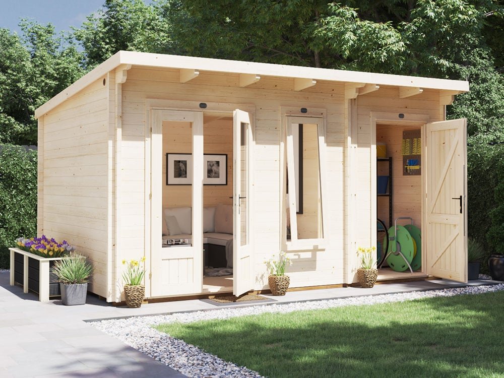 The 4.5m x 3m EvilAmy multi room log cabin lends itself to being a modern Summer House. That being so, the EvilAmy is a versatile garden room with many uses. The extra room can be used for additional storage, saving the expense of a tool store or shed.