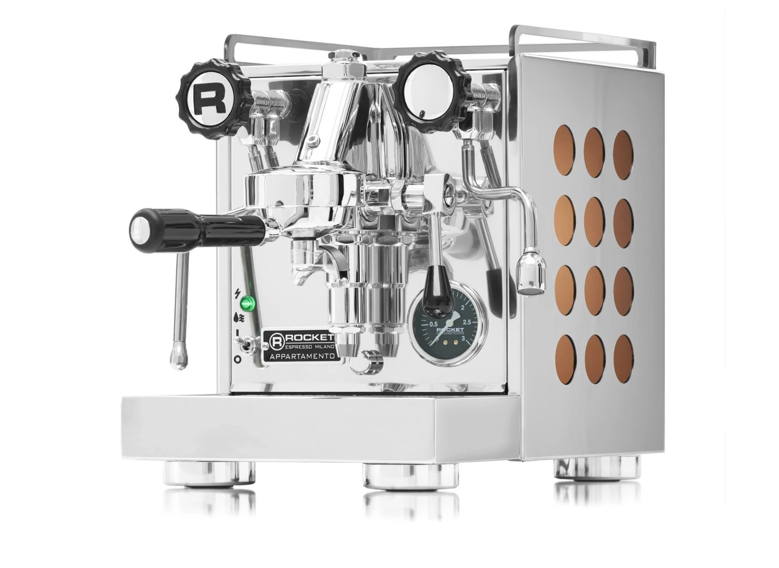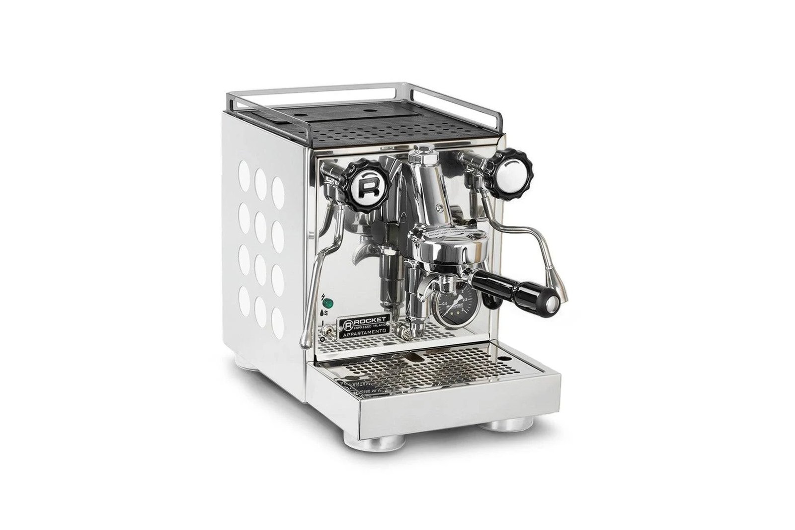 Rocket Appartamento ek premium, hand-built Italian espresso machine hai jo specially home users ke liye design ki gayi hai. Yeh machine un logon ke liye best hai jo ghar par professional café-quality espresso aur milk-based coffee banana chahte hain. Is ka size compact hai, lekin performance commercial-level hoti hai.